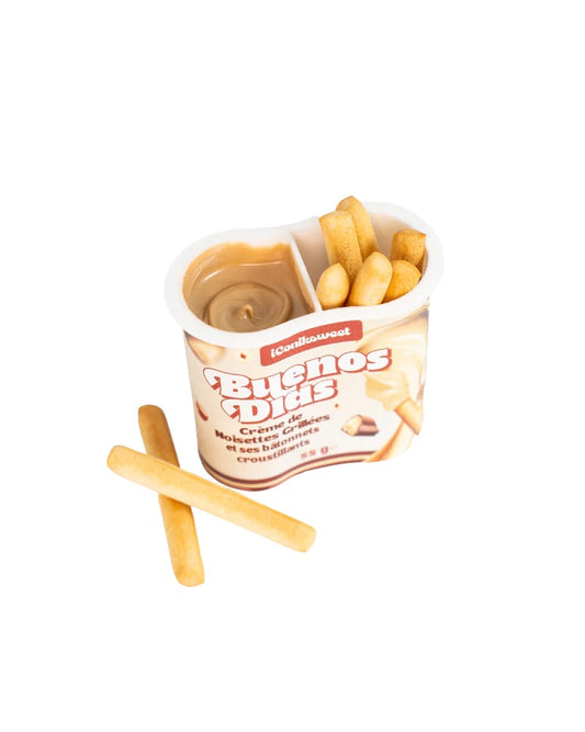Biscuits caramélisés : Farine, sucre, huiles végétales, oeufs, amidon de blé, lait écrémé en poudre, émulsifiant (E322), cannelle, arômes naturels (vanilline, spéculoos). Huiles végétales, sucre, lactosérum en poudre, émulsifiant (E322), arômes naturels (caramel et spéculoos), acidifiant(E330). Gressins : Farine de blé, huiles végétales, sucre, sel, levure.