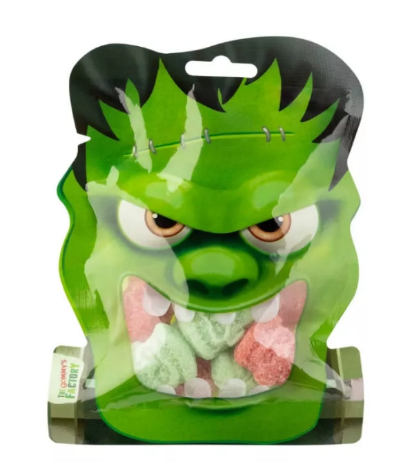 Sachet de 80 grammes de têtes de Frankenstein Orange et Verte en bonbon gélifié à base de pectine recouvert de sucre de la marque The Gommy's Factory - Parfum Pomme et Fraise. Sans gluten.